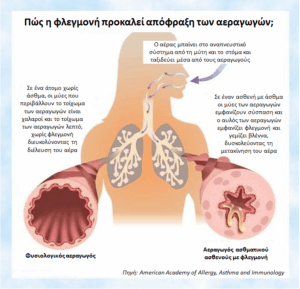 Οι μικροσωματιδιακοί ρύποι (PM2.5) και τα καυσαέρια λειτουργούν ως ερεθιστικοί παράγοντες των αεραγωγών, ενισχύοντας τη φλεγμονή και τη βρογχική υπεραντιδραστικότητα.